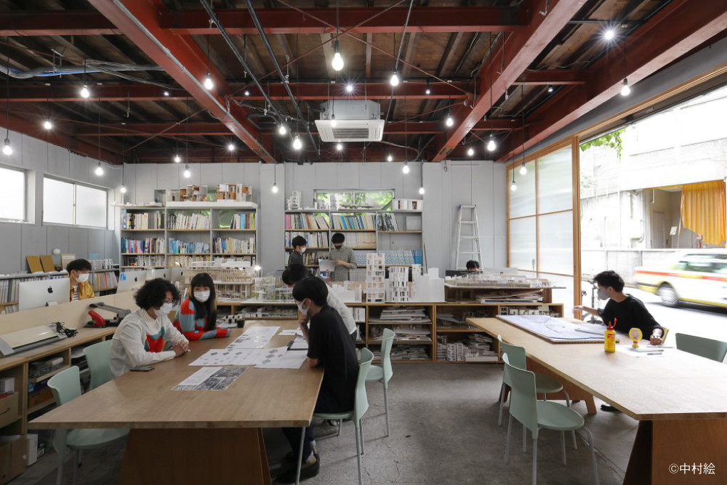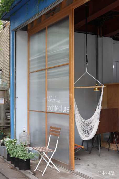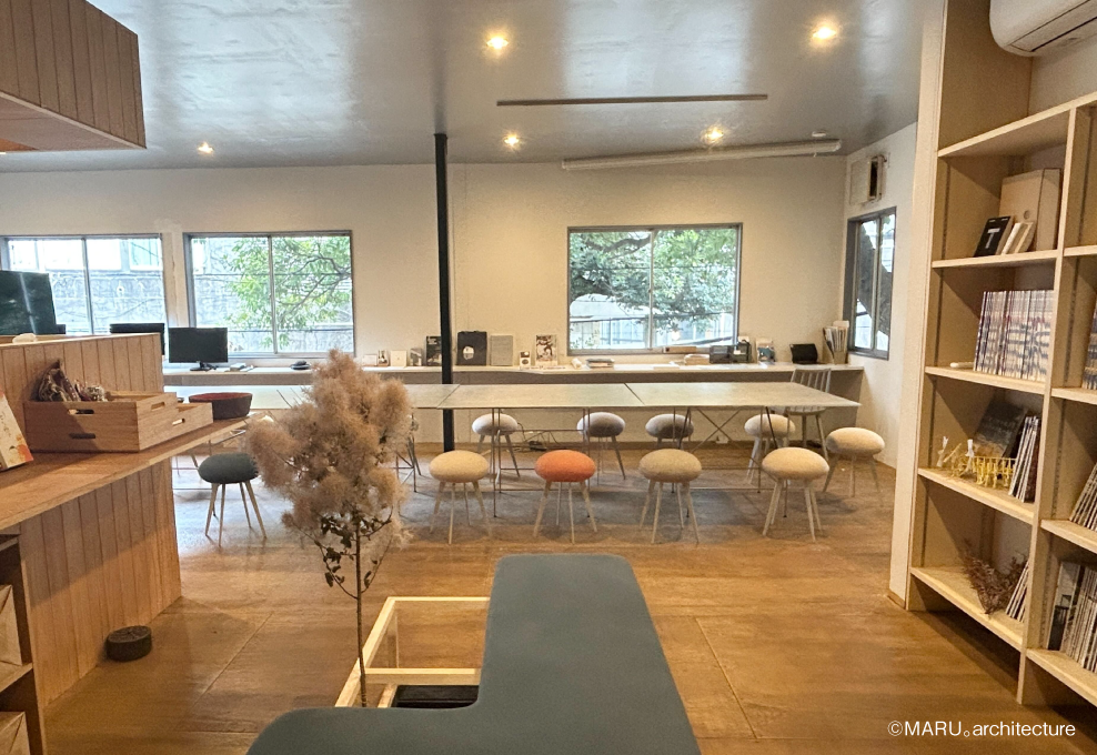 蔦に覆われたかつての印刷工房を設計事務所へリノベーションしたMARU。architecture東京事務所を特別公開します。柔らかく光を取り込む大きな障子のような框戸の中へ足を踏み入れると、コの字型にデスクが配されたスタジアム形式の空間へ。稼働中のすべてのプロジェクトを一望するギャラリーや、上階の打ち合わせスペースに設えられた小さな吹抜けなど、内と外、上と下の境界をゆるくつなぎ、会話が生まれる仕掛けが散りばめられています。まちとつながる建築が生み出される現場で、MARU。architectureの設計思想を体感してください。
