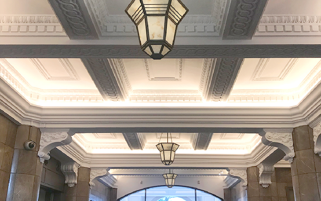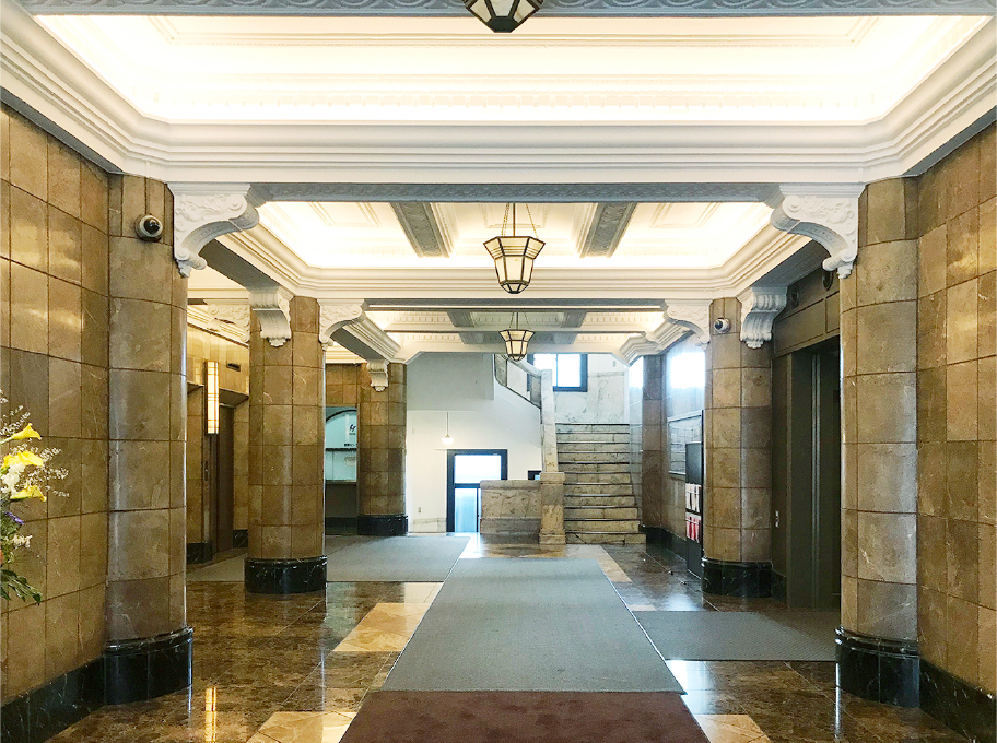 「日証館」は多くの証券会社が入居する建物として建設されました。以前ここに建っていたのは新一万円札の顔としても知られる渋沢栄一の邸宅。日本の資本主義の父の意志を継ぎ、関東大震災後の復興を象徴するビルです。設計を手がけたのは横河民輔が率いた横河工務所。三越日本橋本店や日本工業倶楽部会館など多くの都市の建築を設計しました。今回、普段は業務日しか立ち入れないエントランスホールが特別に公開されます。品格ある外観と共に、ご鑑賞ください。