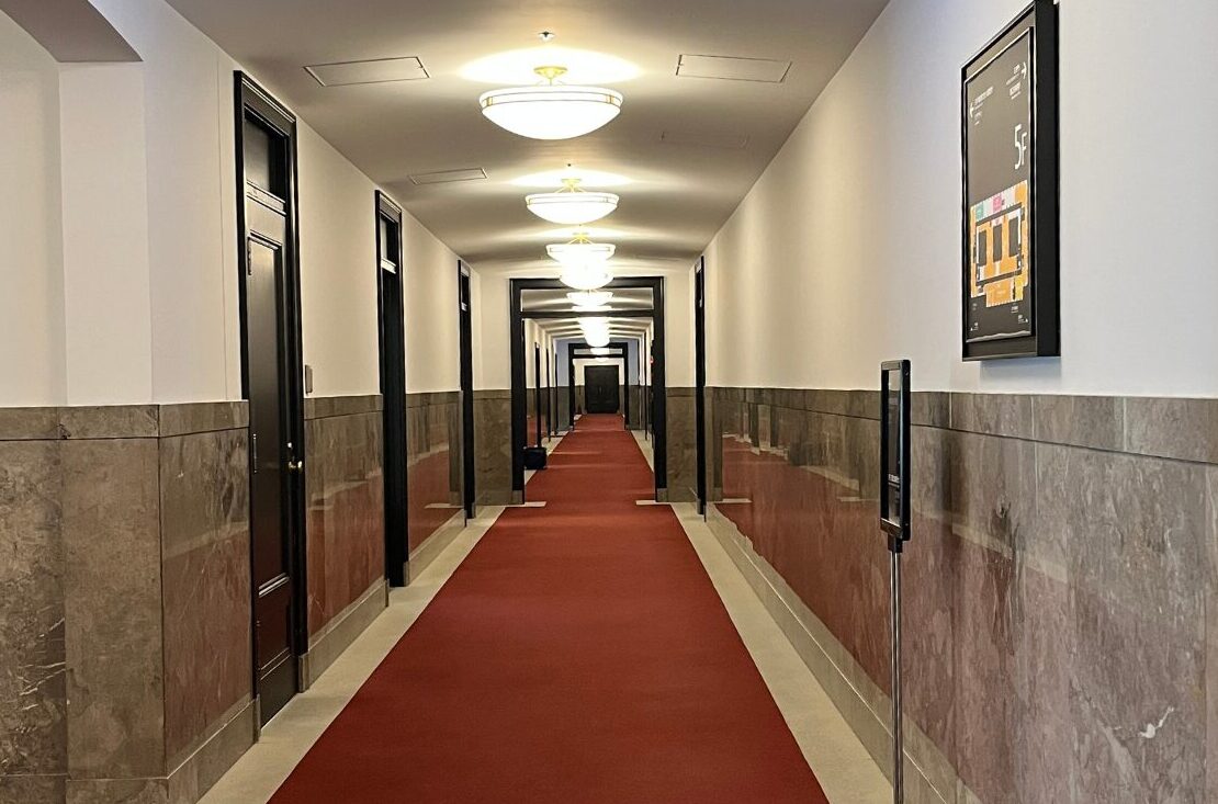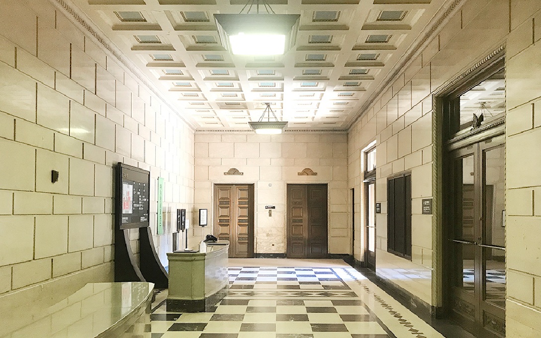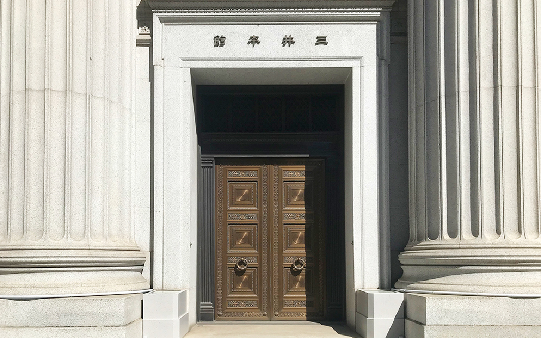 「三井本館」は現存する最古の、アメリカンタイプのオフィスビルです。1Fにある銀行の印象が強いですが、三井合名をはじめ、旧三井物産、三井鉱山など直系各社の本社機能を集中させるために建てられた複合ビルです。そのことが良く分かる合名玄関、エレベーターと5Fオフィスフロアを特別に公開。黒と白でデザインされた美しい床石、格間天井の精巧な装飾、今も現役で稼働する重厚なエレベーターといった創建時からの姿が受け継がれています。密やかで、歴史が感じられる空間です。
