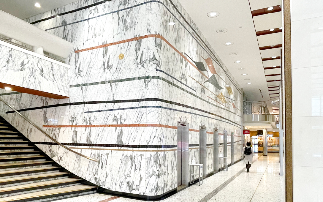 1960年代に丸の内で誕生した新たなビル群。その先鞭をつけた新東京ビルヂングは、アントニン・レーモンド事務所から三菱地所に移り、丸ノ内総合改造計画を担った杉山雅則をはじめ鷲頭昌、岩間旭等の設計によるものです。ガラスの横連窓が目を引く外観デザイン、1Fのエントランスホールは50m街区だった時代の東中通りや東西通りの名残を感じられる十字のコンコースが特徴です。おおらかな空間の中で輝くのは、矢橋六郎作のモザイク画「彩雲流れ」や幾何学的な照明器具。東京建築祭に合わせて、竣工時の写真や図面が特別展示されます。高度成長期ならではの機能性と装飾性との融合に光を当てます。