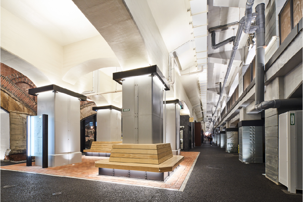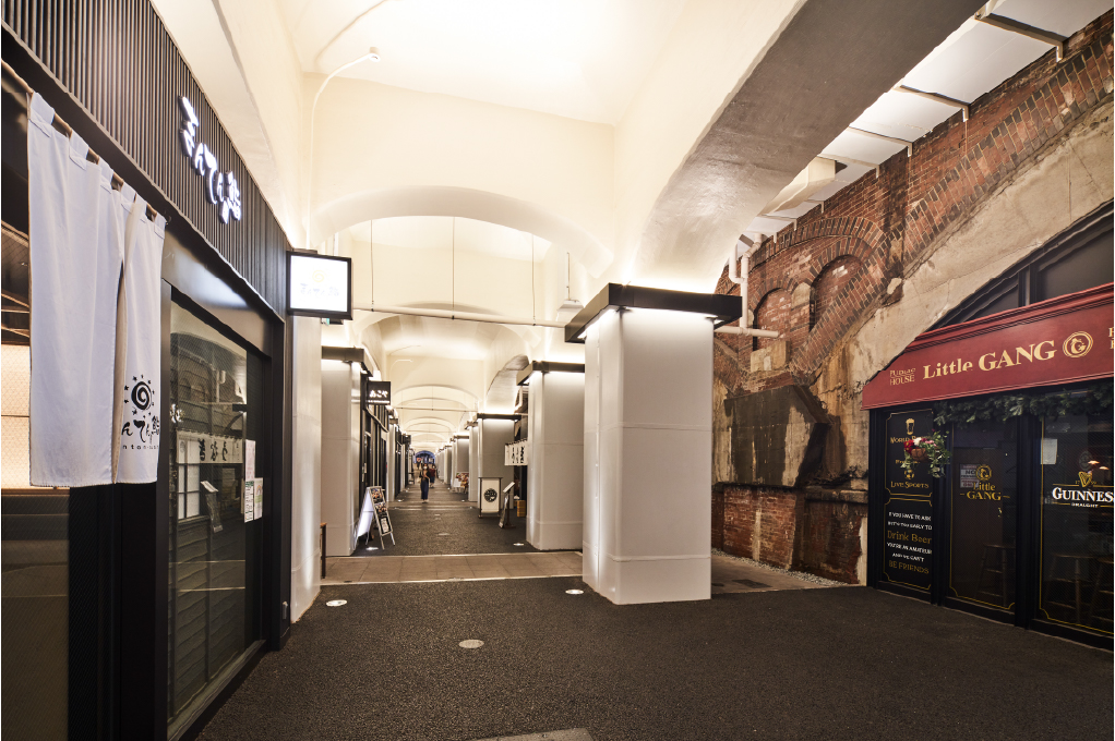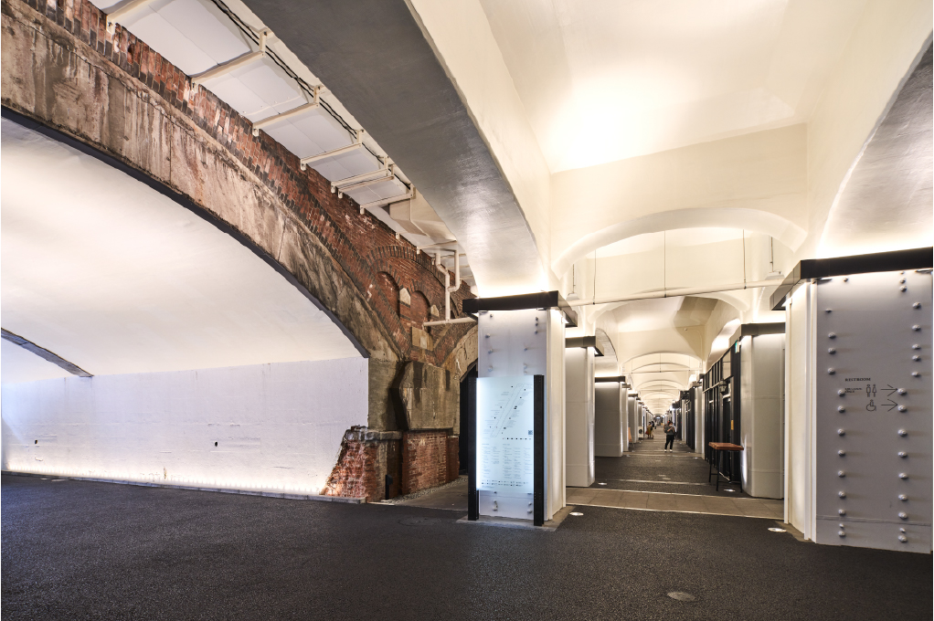 1910年に誕生した日本初の鉄道高架橋が、商業空間として生まれ変わった日比谷OKUROJI。煉瓦アーチの美しさを受け継ぎながら、中央を貫く全長300mの花道を軸に異なる3世代の高架橋を一体として再生されました。今回は、BUNGA NET「高架下建築図鑑」に掲載された遠藤慧さんの描き下ろしイラストと、開発当時の建築資料を展示。鉄道遺構の重厚な質感と、再生の過程が織りなす物語を、体感してください。