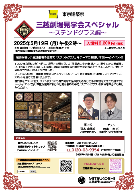 1927年(昭和2年)4月に、世界でも類を見ない百貨店の中の劇場として誕生した三越劇場。2016年(平成28年)に日本橋三越本店本館が国の重要文化財指定をうけるにあたり、優れた装飾様式が高い評価を受けました。2025年5月は「東京建築祭」と連携し、ステンドグラスにスポットを当てた「三越劇場見学会」のスペシャル版を開催します。ステンドグラスの専門家をゲストに迎え、知識豊富な三越劇場副支配人による解説に、技術者ならではの知見も加えてお届けするトークイベントです。華麗な装飾に彩られた場内装飾の中で、“ステンドグラス”の世界を存分にお楽しみください。