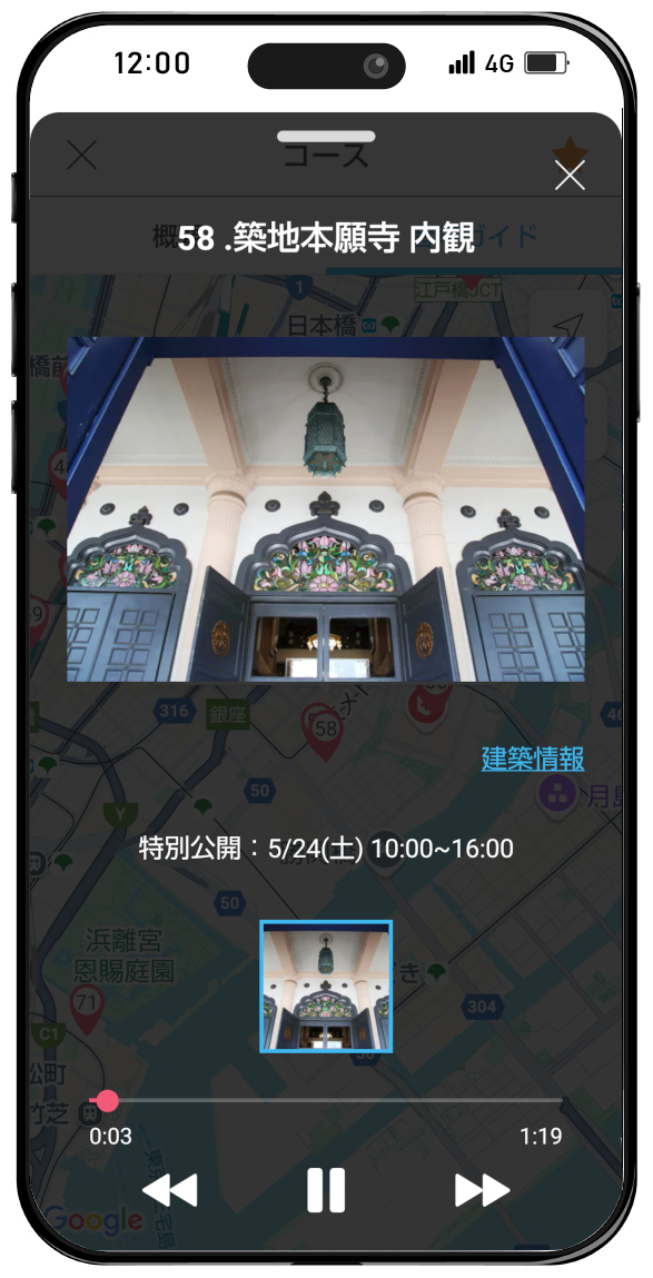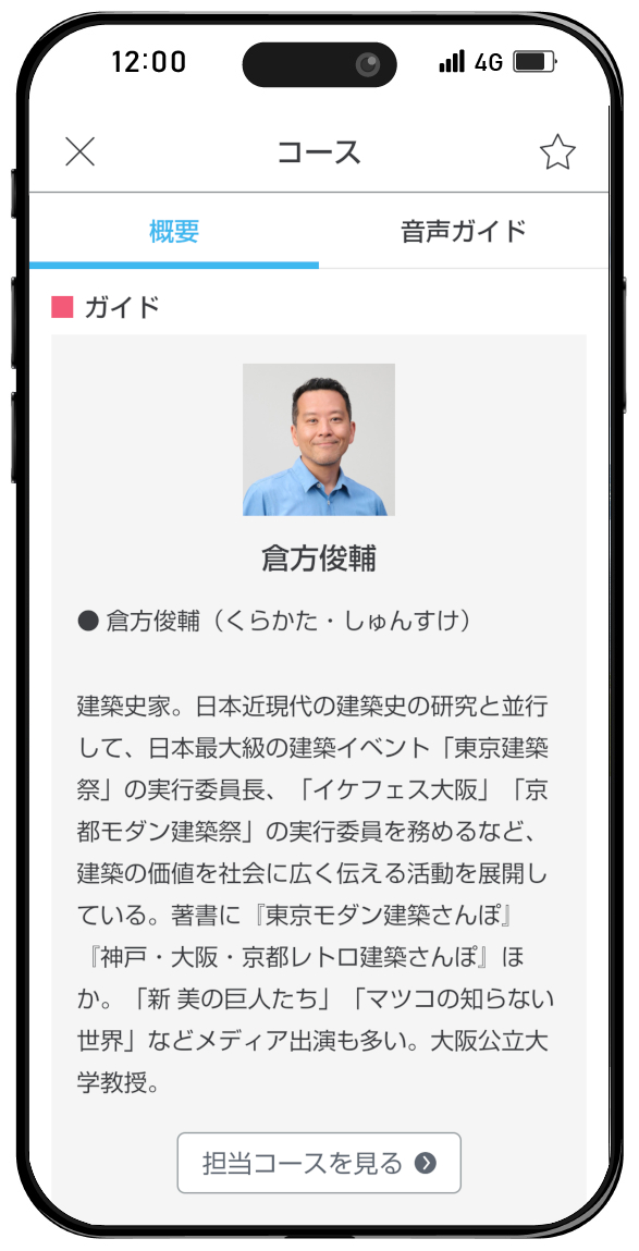 建築史家の倉方俊輔実行委員長が、独自の視点で特別公開・展示の見どころを掘り下げた音声ガイドを収録しています。